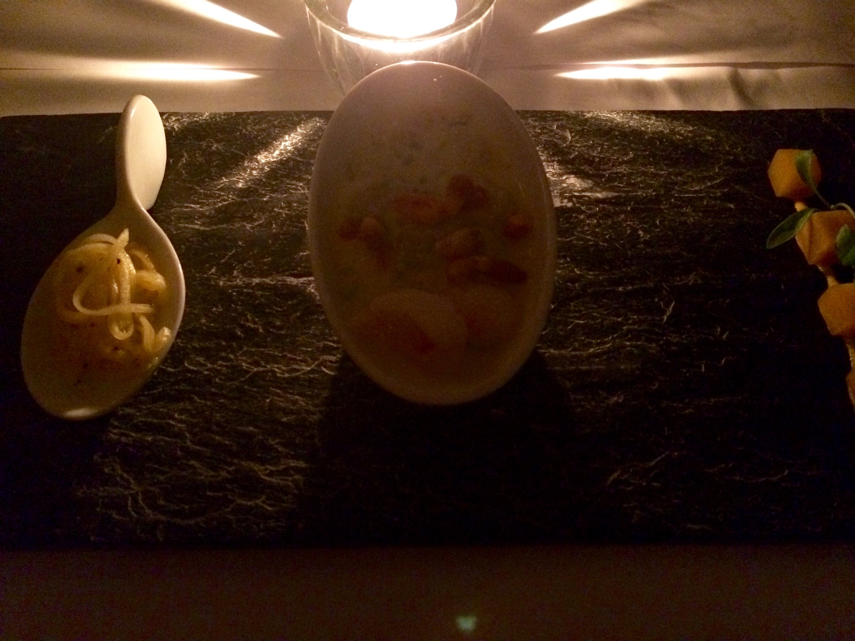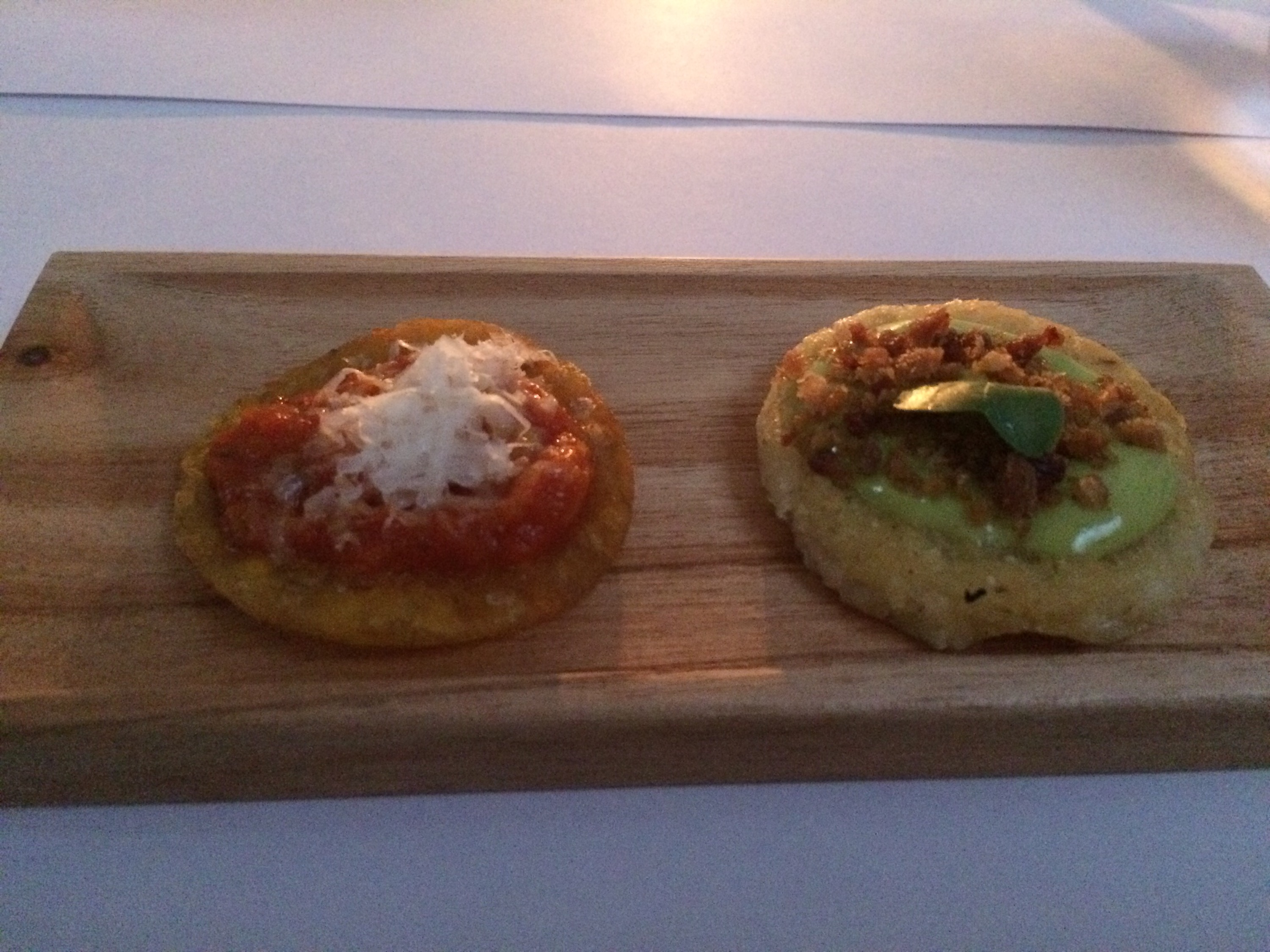 White corn aniseed arepas with spicy avocado mousse and chicharron. Patacon with hogoa and goat cheese.