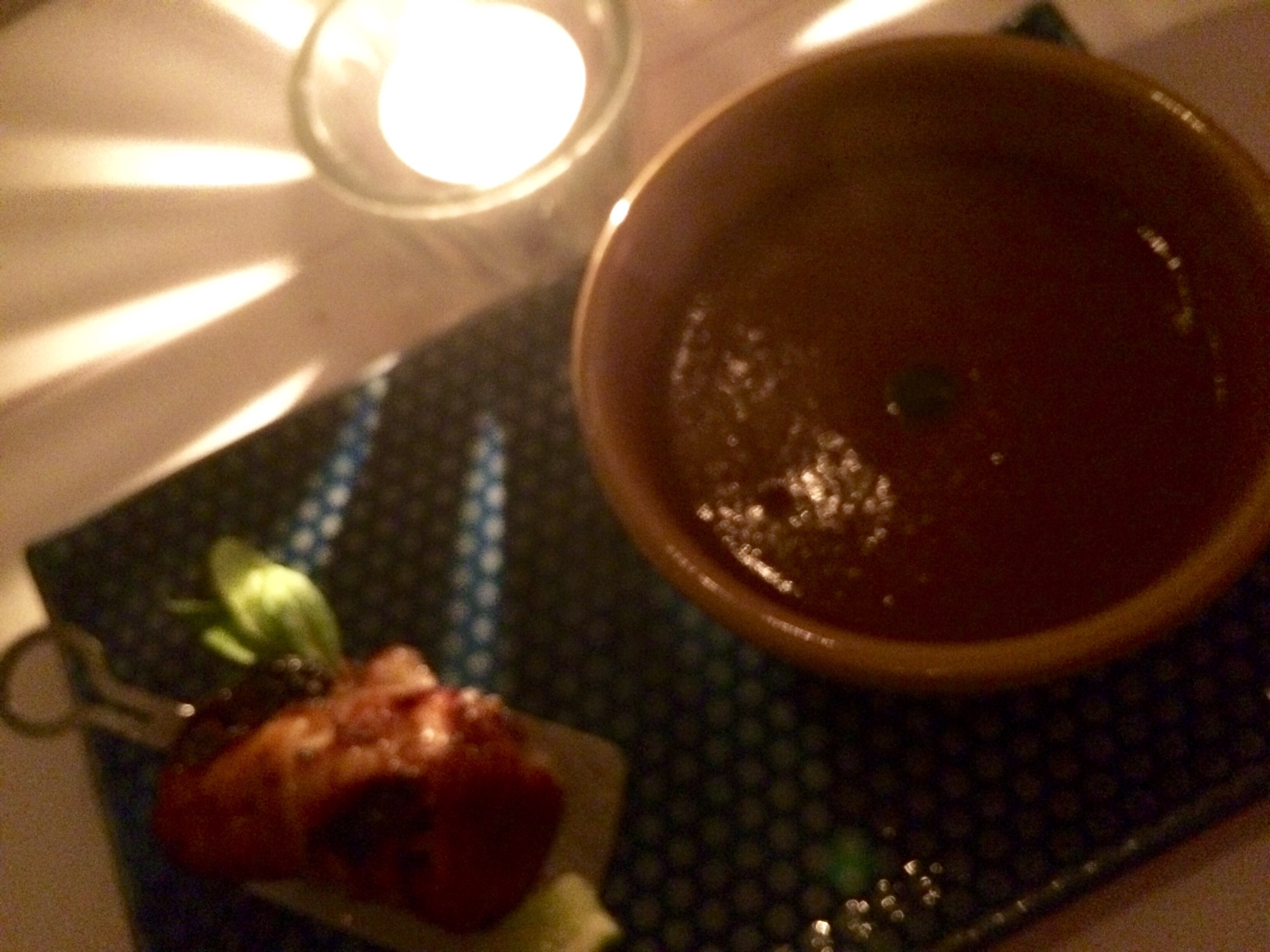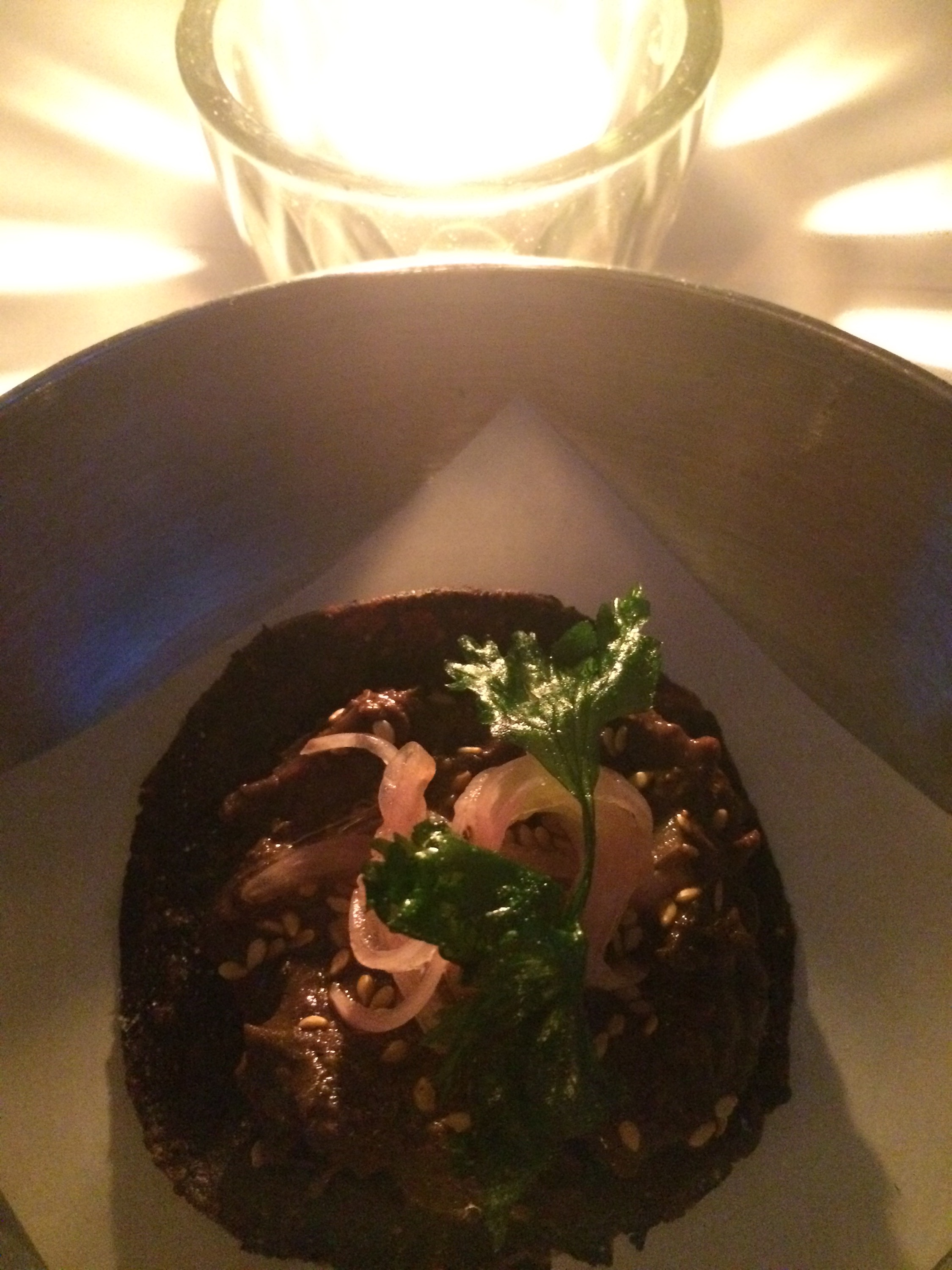 Nixtamized, toasted corn tortilla with beef cheek, Oaxacan mole, and Mexcal-marinated red onions.